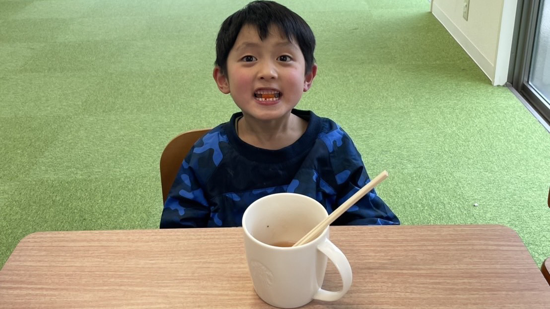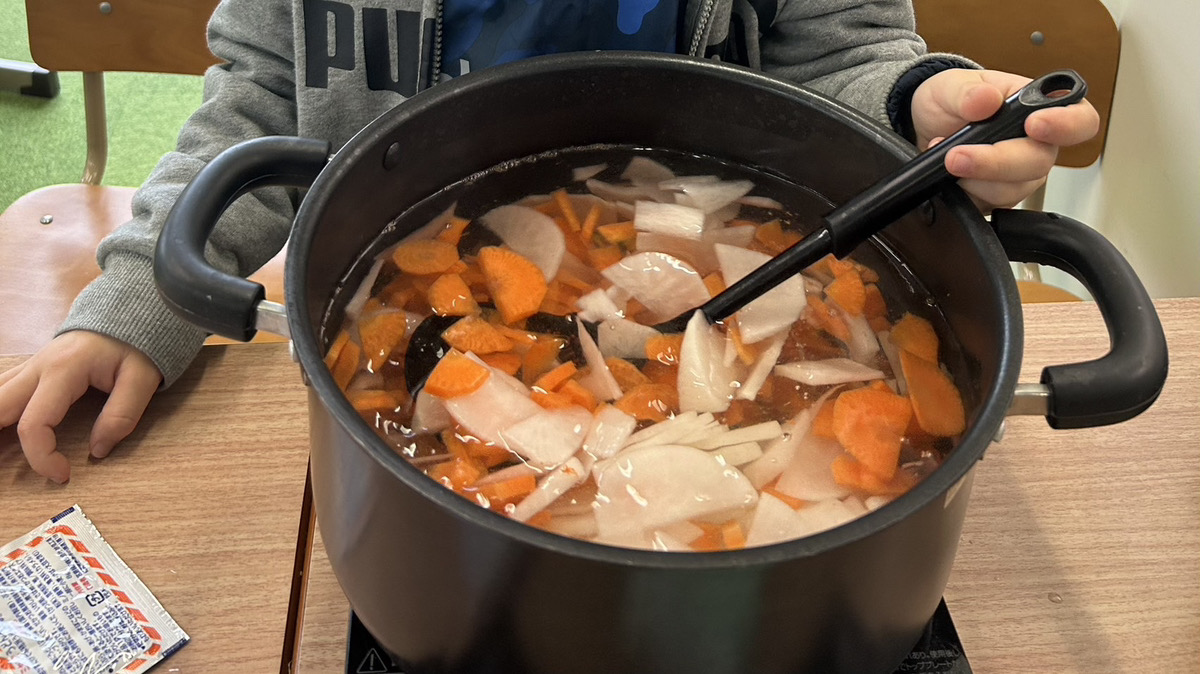 完成したお雑煮を見て達成感いっぱいの表情😊