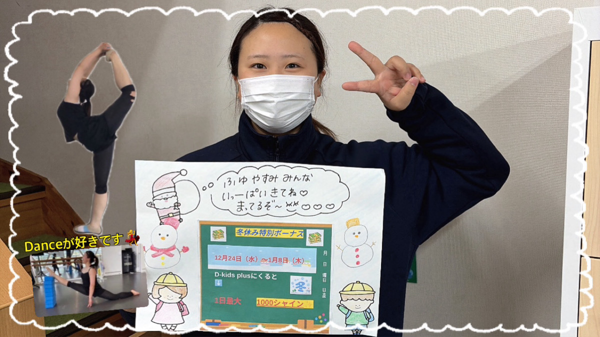 先日、クリスマスのスノードーム作りを行いました❄️✨ 透明な容器の中に好きなパ... 〜職員紹介〜 📛名前:石原先生 ✏️資格:保育士 今回紹介する先生は石原先生... こんにちは☀️ 広報です! 先日、貝塚公園へゴーカートを乗りに行きました🛝 ... こんにちは😊 広報です! 先日モーモーランドへ行き、 乳しぼり体験をしてきました🐮 自分... こんにちは☺️ 広報です♪ 先日モールを使って、 オリジナルのクリスマスリース作りを行いまし... こんにちは🌈 広報です🍒 📛名前:矢野先生 ✏...